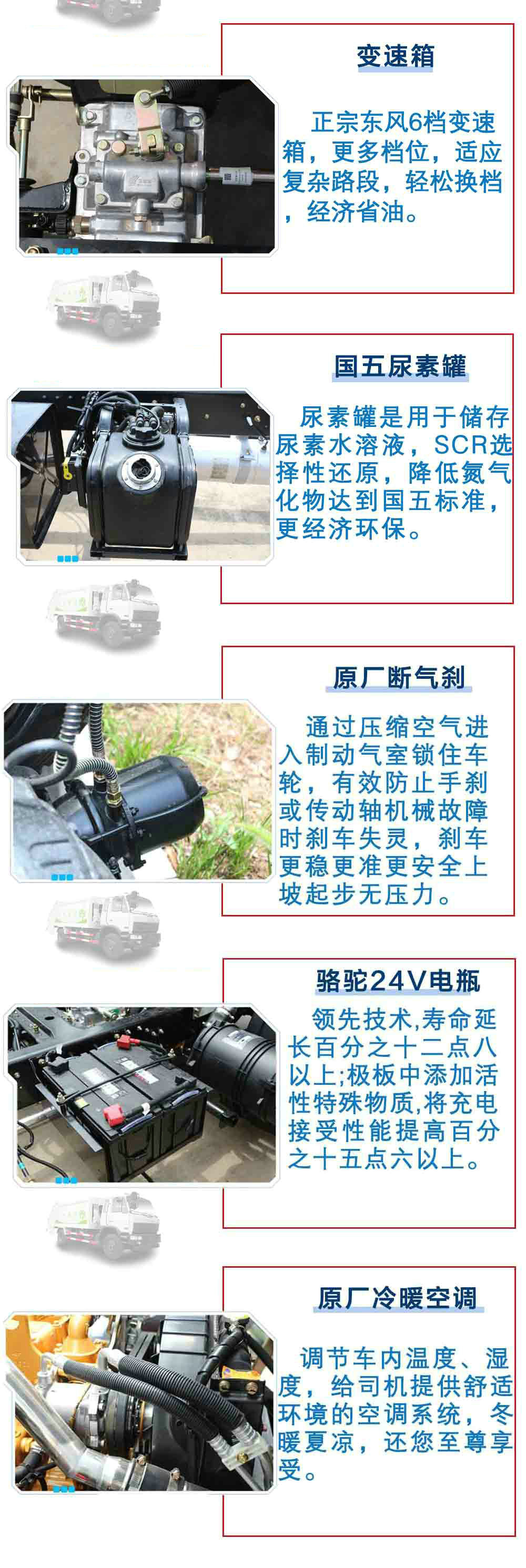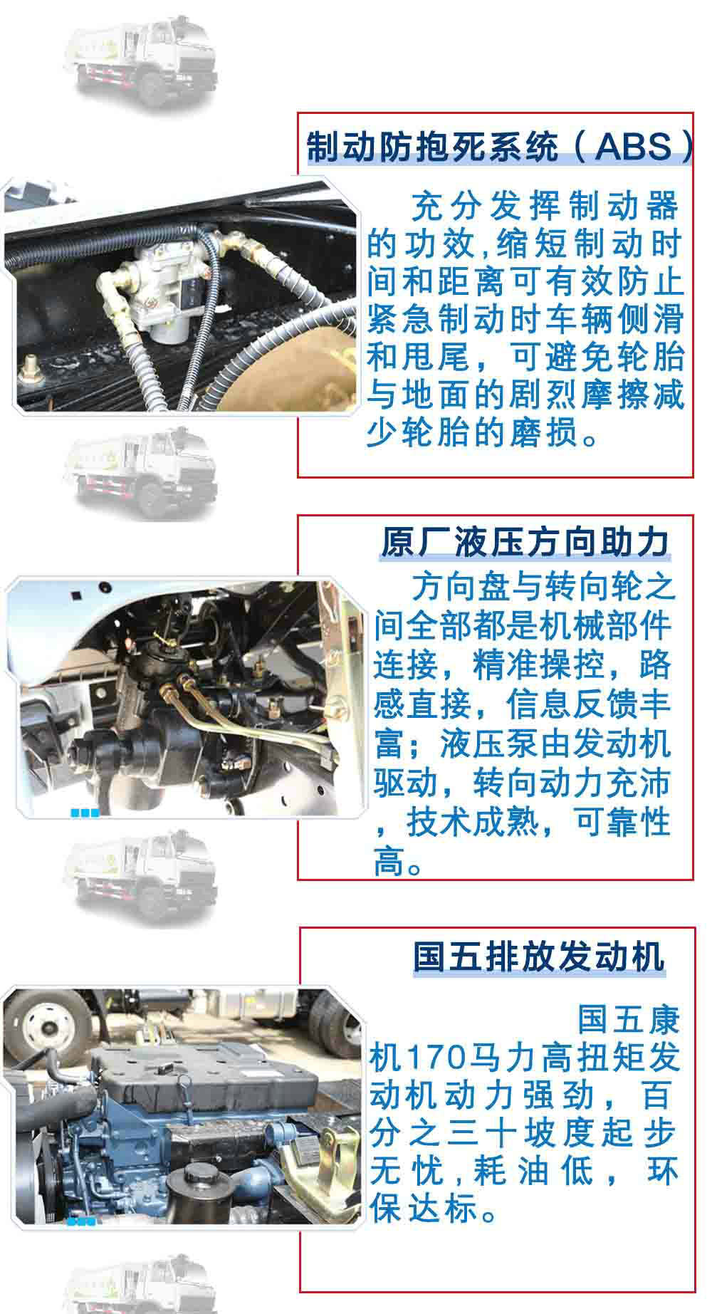 | 其他 | 1、該車選用3950,4500軸距底盤。2、隨底盤選裝駕駛室。3、該車有五種可選翻轉(zhuǎn)樣式,A:三角斗裝置,B:掛桶裝置,C:擺臂裝置,D:大落地斗裝置,E:無后翻轉(zhuǎn)裝置。當(dāng)選擇ABCD時,該車前懸(mm)/整車長(mm)/軸距(mm)/后懸(mm)的對應(yīng)關(guān)系為:1450/8470/4500/2520,1250/8270/4500/2520,1450/7920/3950/2520,1250/7720/3950/2520;當(dāng)選擇E時,該車前懸(mm)/整車長(mm)/軸距(mm)/后懸(mm)的對應(yīng)關(guān)系為:1450/8410/4500/2460, 1250/8210/4500/2460,1450/7860/3950/2460,1250/7660/3950/2460。4、防護(hù)材料:Q235碳鋼,連接方式:左右側(cè)面防護(hù)采用焊接連接在副梁上,后部防護(hù)由專用裝置代替豁免。5、選裝ABS, ABS型號為3631010-C2000,生產(chǎn)廠家為東科克諾爾商用車制動系統(tǒng)(十堰)有限公司。6、車輛顏色、文字噴涂及局部細(xì)節(jié)可變化。7、采用發(fā)動機與油耗值對應(yīng)關(guān)系為(L/100km):ISB170 50/23.8, ISB190 50/23.8, YC4E140-56/23.8,CY4BK151/23.8,CY4SK151/23.8,YC4E160-56/23.8,YC6JA180-50/23.8,YCD4J4S-150/23.8。8、專用裝置:箱體,主要用于城鎮(zhèn)環(huán)衛(wèi)垃圾的收集與運輸。 | ||