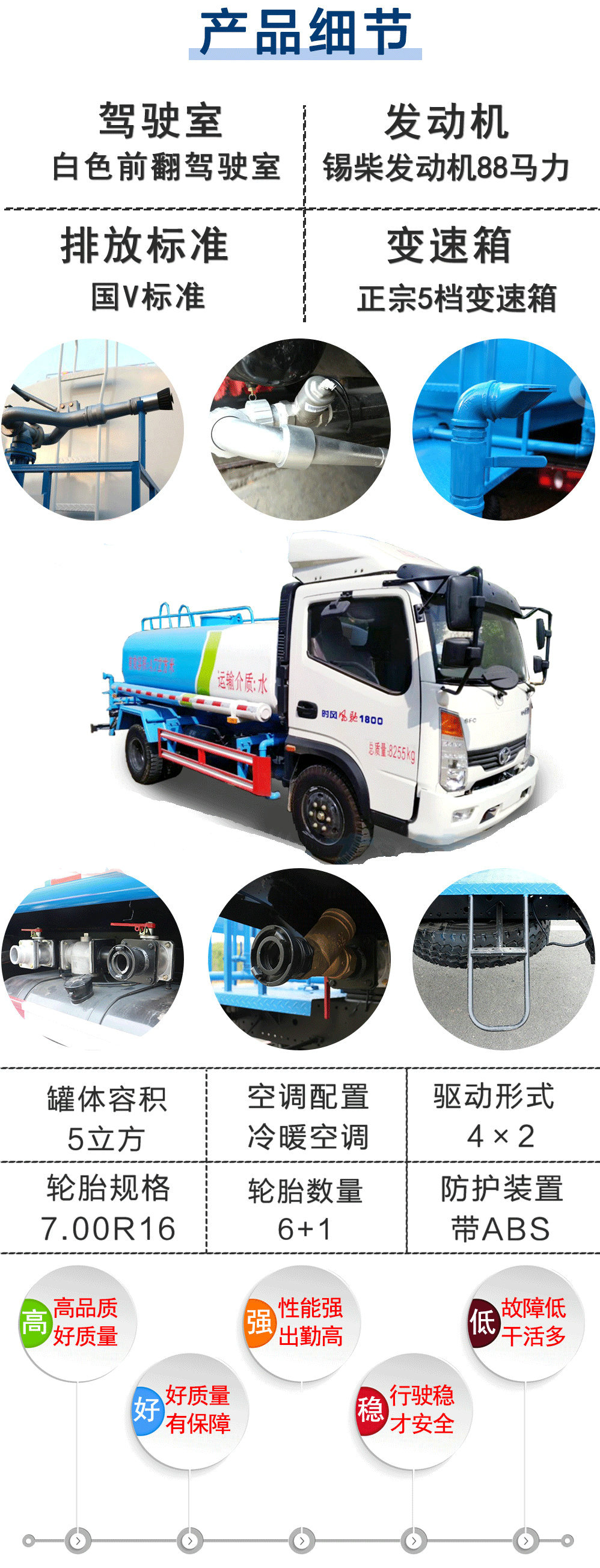 上裝配置:罐體有效容積5立方,罐體采用國(guó)標(biāo)Q235碳鋼,罐體厚度4mm,自吸自排水泵,帶前沖裝置,后灑裝置,左右側(cè)噴裝置,尾部帶有安全操作平臺(tái),帶消防接口,自流口,兩根輸水管,尾部綠化高炮,綠化高炮可調(diào)節(jié)直沖,大雨,中雨,毛毛雨霧,可以連續(xù)調(diào)節(jié),360度旋轉(zhuǎn);