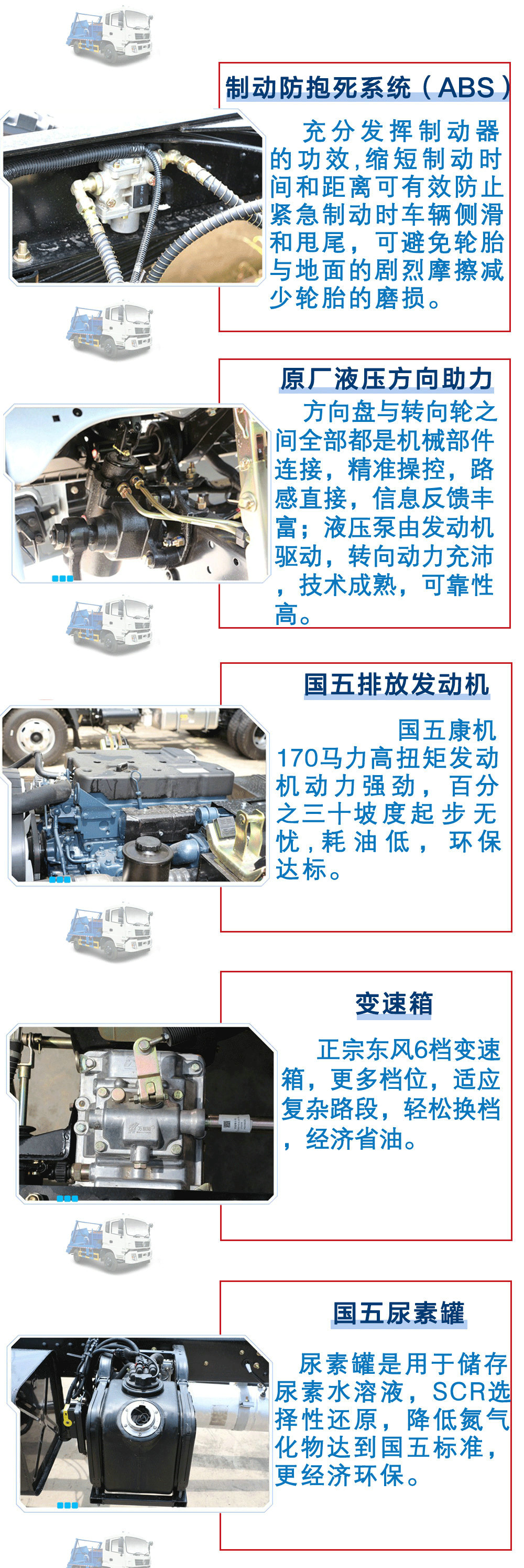 | 其他 | 1,隨底盤(pán)選裝駕駛室。2,該車(chē)整車(chē)長(zhǎng)/前懸/軸距對(duì)應(yīng)關(guān)系為(mm):8110/1440/4500,7920/1250/4500,7560/1440/3950,7370/1250/3950 。3,防護(hù)材料:Q235A碳鋼,連接方式:左右側(cè)面防護(hù)與底板采用焊接連接,后下部防護(hù)與車(chē)架采用焊接連接,后部防斷面尺寸(mm):100×50,后部防護(hù)離地高度(mm):425。4,ABS型號(hào)為ABS-E 4S/4M,生產(chǎn)企業(yè)是威伯科汽車(chē)控制系統(tǒng)(中國(guó))有限公司;該車(chē)安裝帶衛(wèi)星定位功能的行駛記錄儀。5,發(fā)動(dòng)機(jī)與油耗值對(duì)應(yīng)關(guān)系(L/100km):ISD180 50/26.8, YC6JA180-50/27.1,EQH180-52/26.2,ISB210 50/26.5,ISD190 50/26.0,YC4E160-56/25.8,YC4S150-50/25.7。6,車(chē)輛顏色,字體噴涂和局部細(xì)節(jié)可變化。7、專(zhuān)用裝置:擺臂機(jī)構(gòu),主要用于城鎮(zhèn)環(huán)衛(wèi)散裝生活垃圾的收集與運(yùn)輸。 | ||