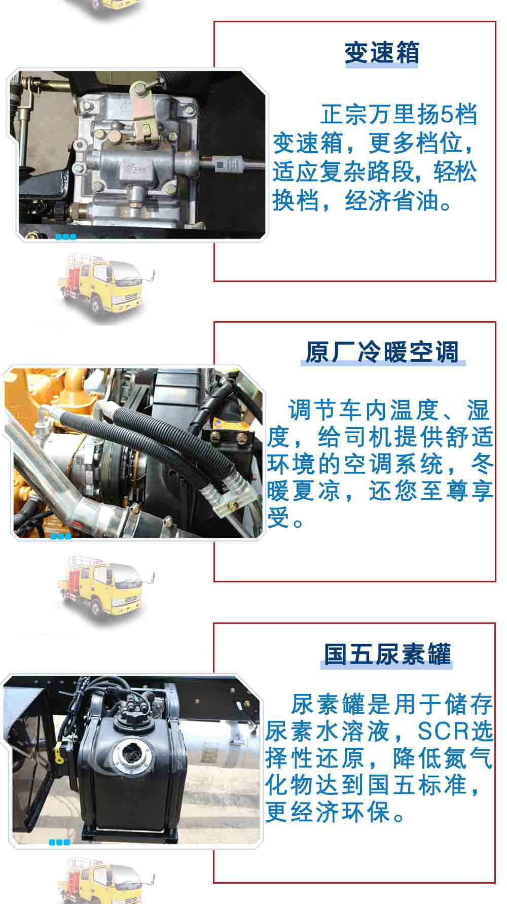 整車配置:江鈴(新款)雙排工程黃駕駛室,軸距3360mm,江鈴115馬力國五發(fā)動機JX493ZLQ4 (環(huán)保),油剎,五檔變速箱,7.00R16鋼絲胎,帶ABS.加裝空調(diào)。作業(yè)高度8米、10米、12米,帶兩個液壓支腿,吊藍額定載荷小于或等于500KG,工作壓力14MPA,帶油缸鎖定功能。