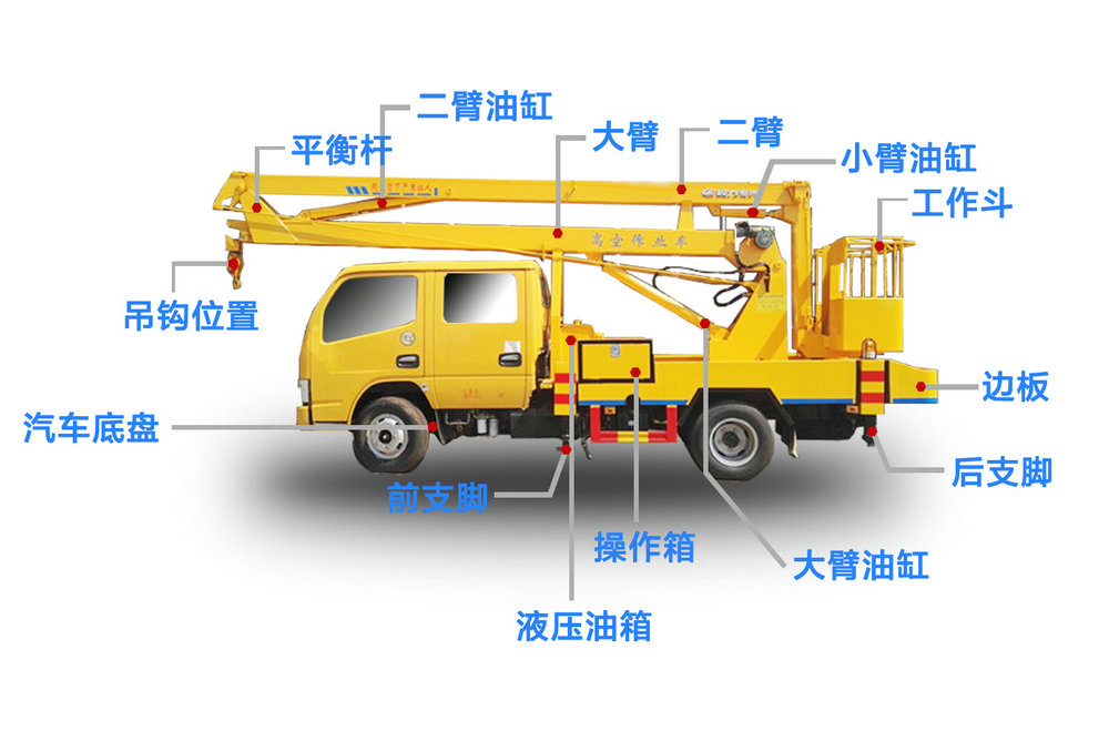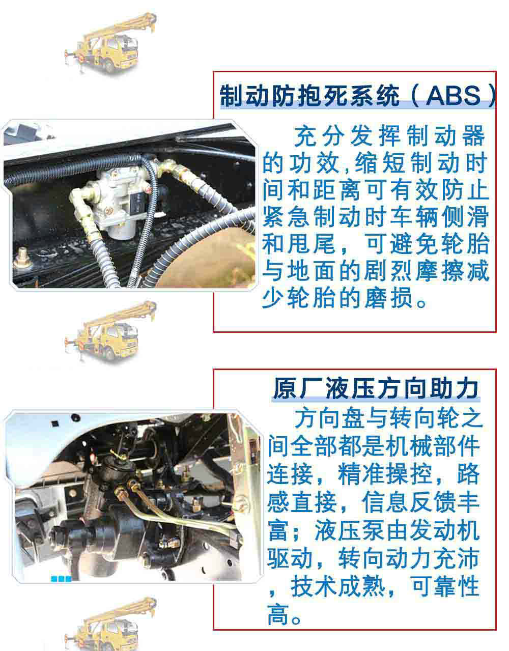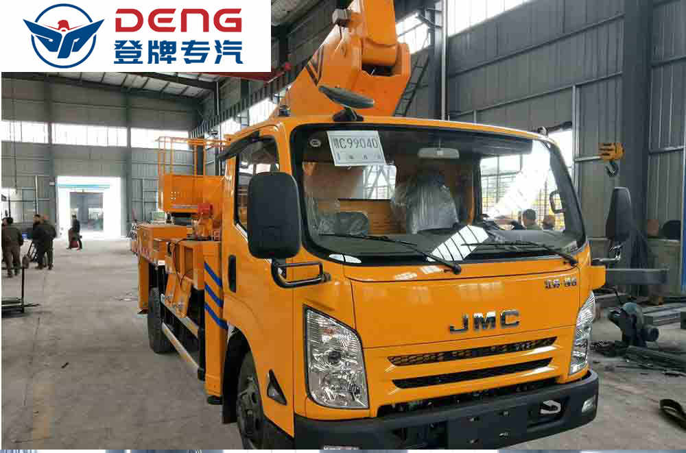 江鈴(新款)雙排工程黃駕駛室,軸距3360mm,江鈴115馬力國五發(fā)動機,油剎,五檔變速箱,7.00R16鋼絲胎,帶ABS.加裝空調(diào)。作業(yè)高度14米,液壓360度全回轉(zhuǎn),三節(jié)折疊臂,1噸可伸縮式吊鉤。單液壓舉升缸,帶雙向平衡閥,電控操作舉升臂,四支液壓油缸可調(diào)式支腿帶雙向液壓鎖(支腿操作為手動操作,可單獨控制)、最大作業(yè)幅度6.2米、最大起吊高度7.5米。