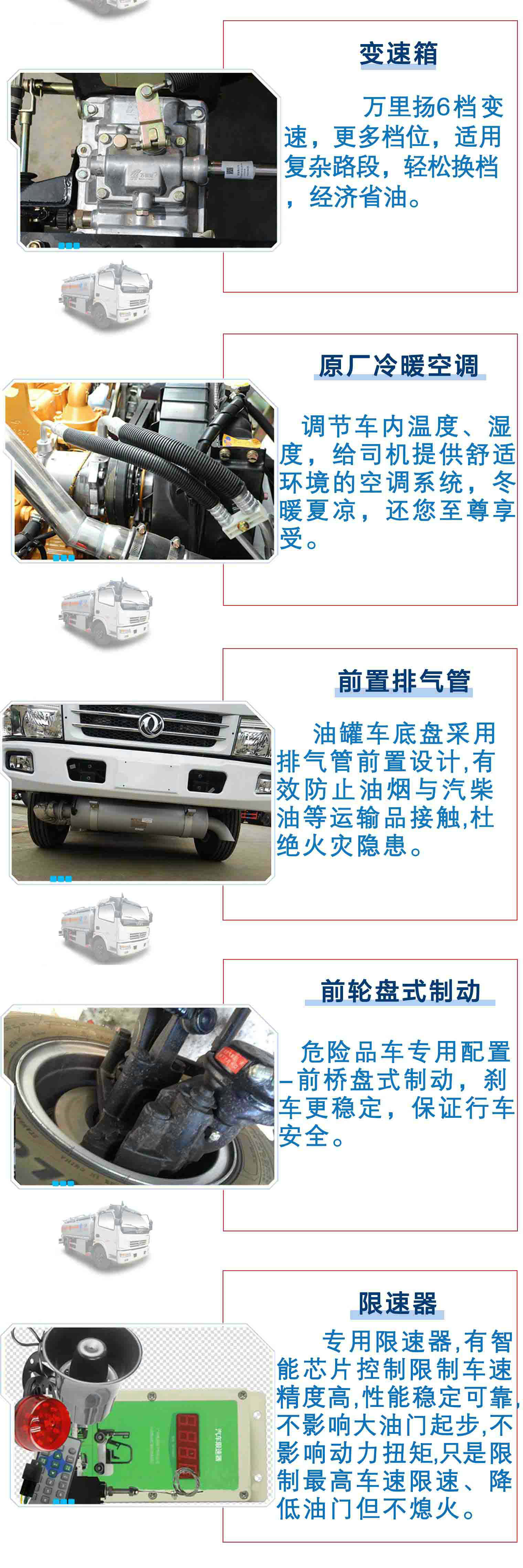 | 其他 | 1、該車適用于危險品運輸,運輸介質為柴油,煤油,汽油;密度分別為830,800,750千克/立方米;類項號:3;罐體有效容積:8.2立方米。罐體外形尺寸(長×長軸×短軸)(mm):4800×1950×1300。2、防護材料:Q235A碳鋼,連接方式:左右側面及后下部防護均采用焊接連接,后部防護斷面尺寸(mm):110×50,后部防護離地高度(mm):390。3、該車可裝配加油裝置型號及生產企業(yè):BL1111Z/珠海市貝林加油設備有限公司中山分公司,HS1812B/托肯恒山科技(廣州)有限公司,SKES-1112/上海伯萊機械有限公司,SK20QF-111A,SK20QF-222A/鄭州三金石油設備制造有限公司,CS20D1110F/正星科技有限公司, JSK-70B1121CZ/穩(wěn)恩佳力佳(北京)石油化工設備有限公司,ZH6444/佛山市眾澤機電科技有限公司。4、僅采用底盤子午線輪胎和帶ABS的底盤; 該車前輪安裝盤式制動器,前置排氣管,裝配限速裝置,限速80km/h。安裝帶有衛(wèi)星定位功能的行駛記錄儀。ABS系統(tǒng)生產廠家及型號:襄陽東風隆誠機械有限責任公司,ABS/ASR-24V-4S/4M。5、隨底盤選裝前面罩,前保險杠,前組合燈具;可選裝不帶走臺,工具箱位置可選擇。 | ||