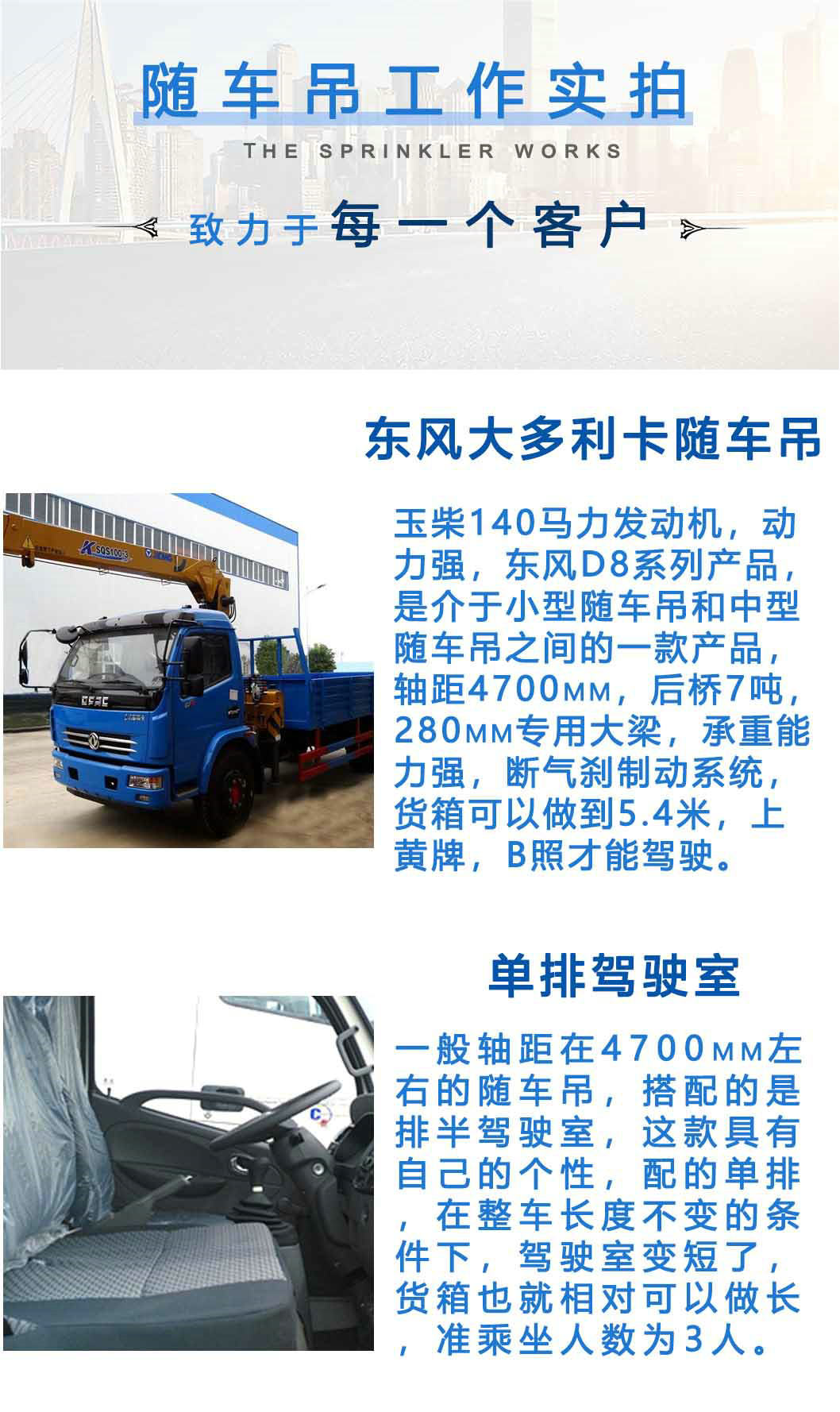隨車(chē)吊采用國(guó)內(nèi)知名吊機(jī)及液壓泵系統(tǒng),可根據(jù)用戶(hù)需求選用不同長(zhǎng)度、噸位的貨廂或吊機(jī)。具備功率大,車(chē)速高、爬坡能力強(qiáng),起升高度高,作業(yè)范圍大。可實(shí)現(xiàn)快速升降,高效、節(jié)能。具有機(jī)動(dòng)靈活、方便高效、安全可靠等優(yōu)點(diǎn)。