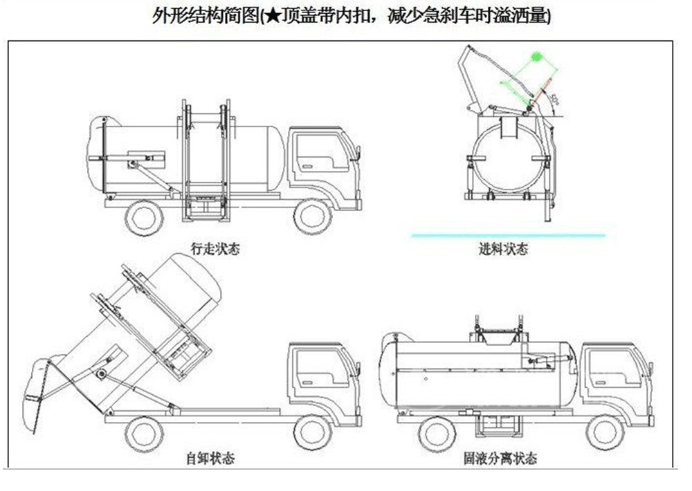 | 其他 | 介質(zhì):餐廚垃圾,密度:800千克/立方米,罐體有效容積:8.13立方米,罐體外形尺寸(直段長×直徑)(mm):3800×1600。該車右側(cè)面配備垃圾上料裝置,用于作收集餐廚垃圾。防護材料:Q235A碳鋼,連接方式:左右側(cè)面及后下部防護均采用焊接連接,后部防護斷面尺寸(mm):120×50,后部防護離地高度(mm):400。 ABS系統(tǒng)型ABS/ASR-24V-4S/4M,ABS系統(tǒng)生產(chǎn)廠家襄陽東風(fēng)隆誠機械有限責(zé)任公司。此整車長/軸距對應(yīng)關(guān)系為(mm):6850/3800,7000/3950,7100/4050,7150/4100,7450/4400。當(dāng)軸距為(3800mm,3950mm)時,整備質(zhì)量為5600kg,當(dāng)軸距為(4050mm,4100mm,4400mm)時,整備質(zhì)量為6400kg。隨底盤選裝駕駛室。 | ||