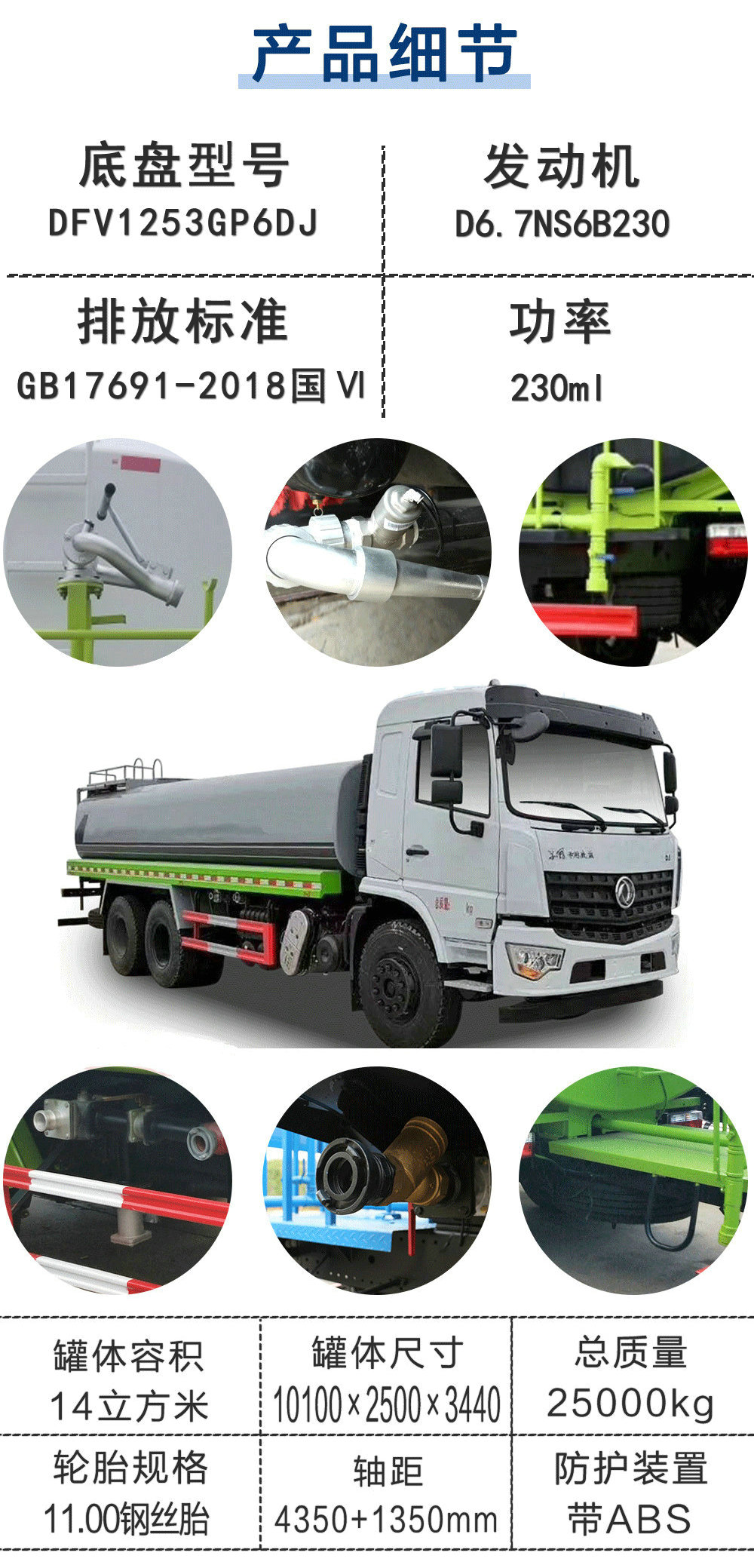 | 其他 | 1、該車主要用于園林綠化,主要專用裝置為水罐和噴灑總成。運輸介質(zhì):水.密度:1000千克/立方米,罐體有效容積:14.74立方米,罐體外形尺寸(長×長軸×短軸)(mm): 6000X2300X1450。僅選用軸距: 4350+1350mm 2、側(cè)/后防護材料為Q235B,側(cè)防護螺栓連接,后防護焊接,截面尺寸(mm):150×50,離地高(mm):480。3、隨底盤選裝駕駛室,選裝后部LED箭頭指示燈,選裝方形裝卸軟管箱,選裝后弧形噴霧。ABS型號/生產(chǎn)廠家:3631010-C2000/東科克諾爾商用車制動系統(tǒng)(十堰)有限公司。 | ||