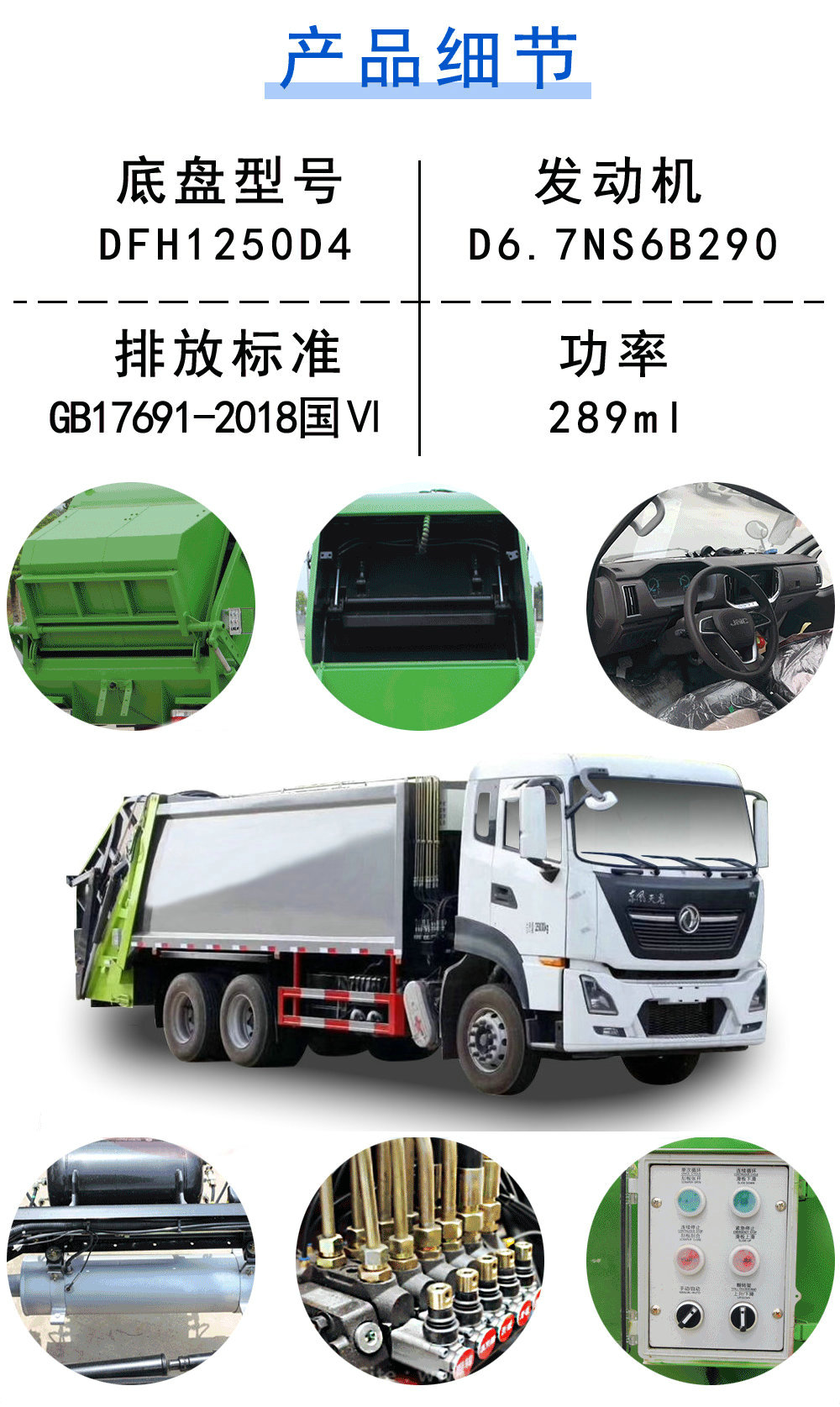 | 其他 | 隨底盤選裝駕駛室;該車可選圓弧箱體,可選6種后部配置:A(無上料裝置,基本型),B(選裝翻桶裝置),C(選裝翻蓋翻桶型裝置),D(選裝三角斗裝置),E(選裝全密封斗裝置),F(選裝擺臂裝置)對應(yīng)關(guān)系為:軸距/外形長/前懸/后懸/后伸/整備質(zhì)量/額定載質(zhì)量對應(yīng)關(guān)系為(mm):4350+1350/10100/1480(1500)/2920(2900)/0/14180/10625,10690;4350+1350/10460/1480(1500)/2920(2900)/360/14900/9905,9970;4350+1350/10280/1480(1500)/2920(2900)/180/15570/9235,9300.側(cè)防護(hù)采用Q235材質(zhì)焊接連接,后部防護(hù)由專用裝置替代,后部防護(hù)離地高度(mm):500.ABS型號/生產(chǎn)廠家:3631010-C2000/東科克諾爾商用車制動系統(tǒng)(十堰)有限公司,ABS 8/東科克諾爾商用車制動系統(tǒng)(十堰)有限公司,4460046450/威伯科汽車控制系統(tǒng)(中國)有限公司.安裝具有衛(wèi)星定位功能的行駛記錄儀.發(fā)動機(jī)型號/油耗值(L/100km)對應(yīng)關(guān)系: D6.7NS6B290/32;DDi75E350-60/31.7,DDi75E300-60/31.7.裝備有垃圾箱液壓機(jī)構(gòu)和堵塞器,將垃圾自行壓實裝入轉(zhuǎn)運(yùn)的專用汽車. | ||