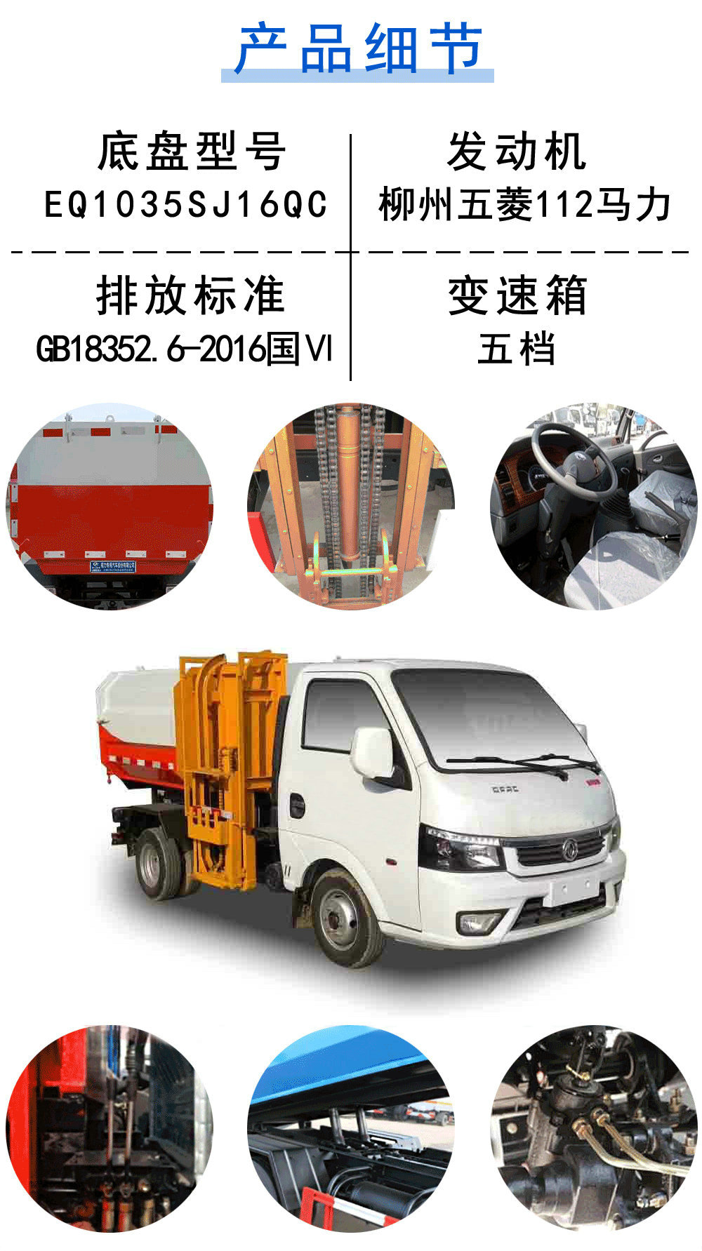 | 其他 | 1、自卸方式:后卸。僅選用2600mm和2800mm軸距,整車長/軸距的對應(yīng)關(guān)系為(mm):5070/2800,4870/2600。2、發(fā)動機(jī)LJ4A15Q6,對應(yīng)油耗值為(L/100km):9.1。3、ABS型號及廠家:APG3550500A,浙江亞太機(jī)電股份有限公司。4、該車裝備有掛桶提升機(jī)構(gòu)及后傾卸式車廂,實(shí)現(xiàn)自裝卸功能,該車主要用于城市生活垃圾收集運(yùn)輸。 | ||