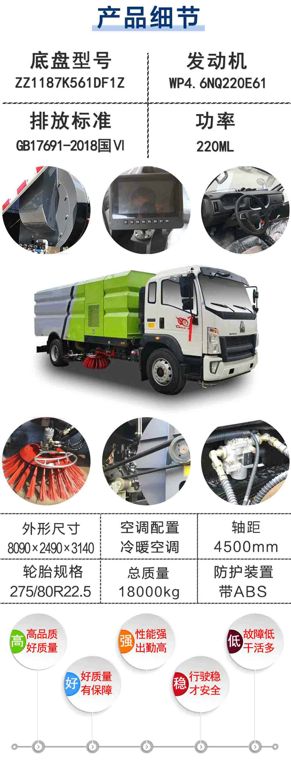 | 其他 | 此車為道路洗掃專用車輛,專用裝置為掃刷.防護(hù)裝置均采用Q235A材質(zhì),均采用焊接連接,專用裝置掃刷代替部分側(cè)面防護(hù),掃刷離地高為(mm):180,后下部防護(hù)與車架焊接連接,后下部防護(hù)尺寸:50×150(mm),離地面高度420mm. ABS系統(tǒng)型號(hào)為XH-KQ4S4M-E01,生產(chǎn)企業(yè)為廣州市西合汽車電子裝備有限公司;型號(hào)為CM4XL-4S/4M,生產(chǎn)企業(yè)為廣州瑞立科密汽車電子股份有限公司.整車長(zhǎng)/軸距對(duì)應(yīng)關(guān)系為(mm):7590/4200,7890/4500,8090/4700,8590/5200,8990/5600.選裝不同的外觀圖片.隨底盤選裝駕駛室. | ||