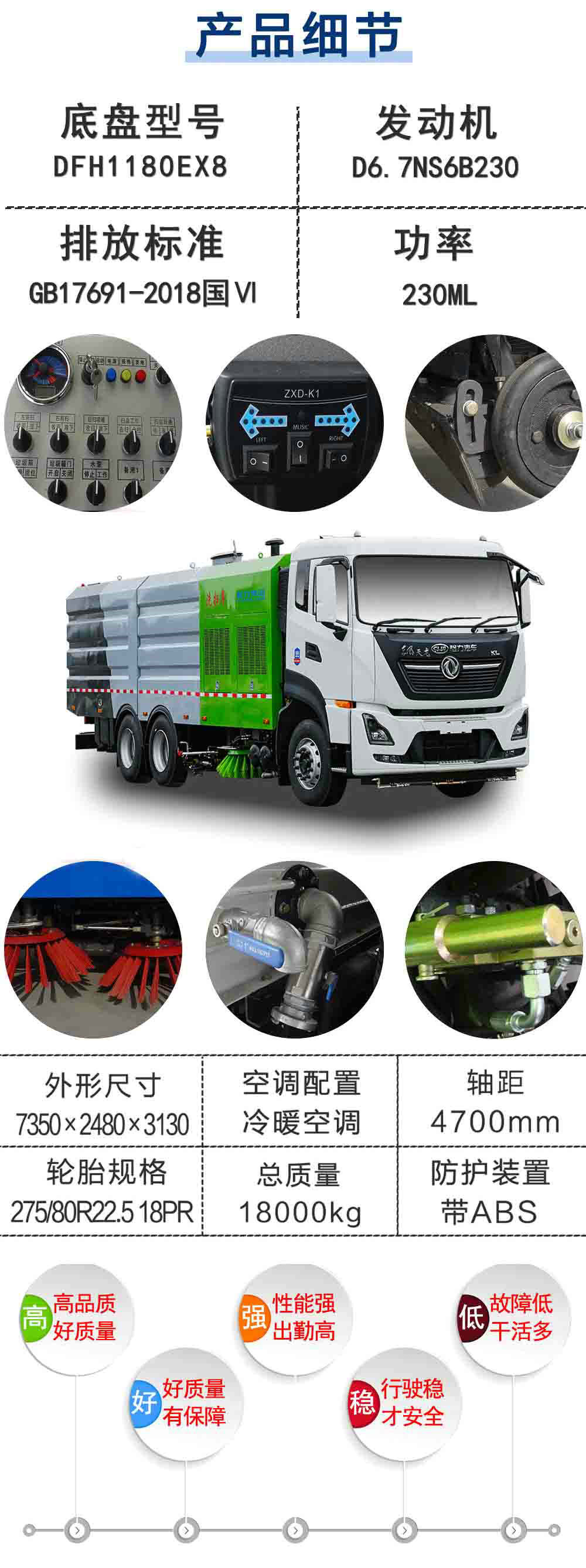 | 其他 | 此車為道路洗掃專用車輛,專用裝置為掃刷.防護材料:Q235A碳鋼,連接方式:左右側面防護為掃刷,離地高為(mm):200,后下部防護與車架采用焊接連接,后下部防護尺寸:50×240(mm),離地面高度360mm.隨底盤選裝駕駛室.ABS型號/生產(chǎn)廠家:3631010-C2000/東科克諾爾商用車制動系統(tǒng)(十堰)有限公司,ABS 8/東科克諾爾商用車制動系統(tǒng)(十堰)有限公司, 4460046450/威伯科汽車控制系統(tǒng)(中國)有限公司.此整車長/前懸/軸距/后懸對應關系為(mm);9350/1400/5800/2150,,8850/1400/5300/2150,8550/1400/5000/2150,8250/1400/4700/2150,8050/1400/4500/2150,7750/1400/4200/2150,7500/1400/3950/2150,7350/1400/3800/2150,9350/1430/5800/2120,8850/1430/5300/2120,8550/1400/5000/2120,8250/1400/4700/2120,8050/1430/4500/2120,7750/1430/4200/2120,7500/1430/3950/2120,7350/1430/3800/2120.選裝不同外形圖片. | ||