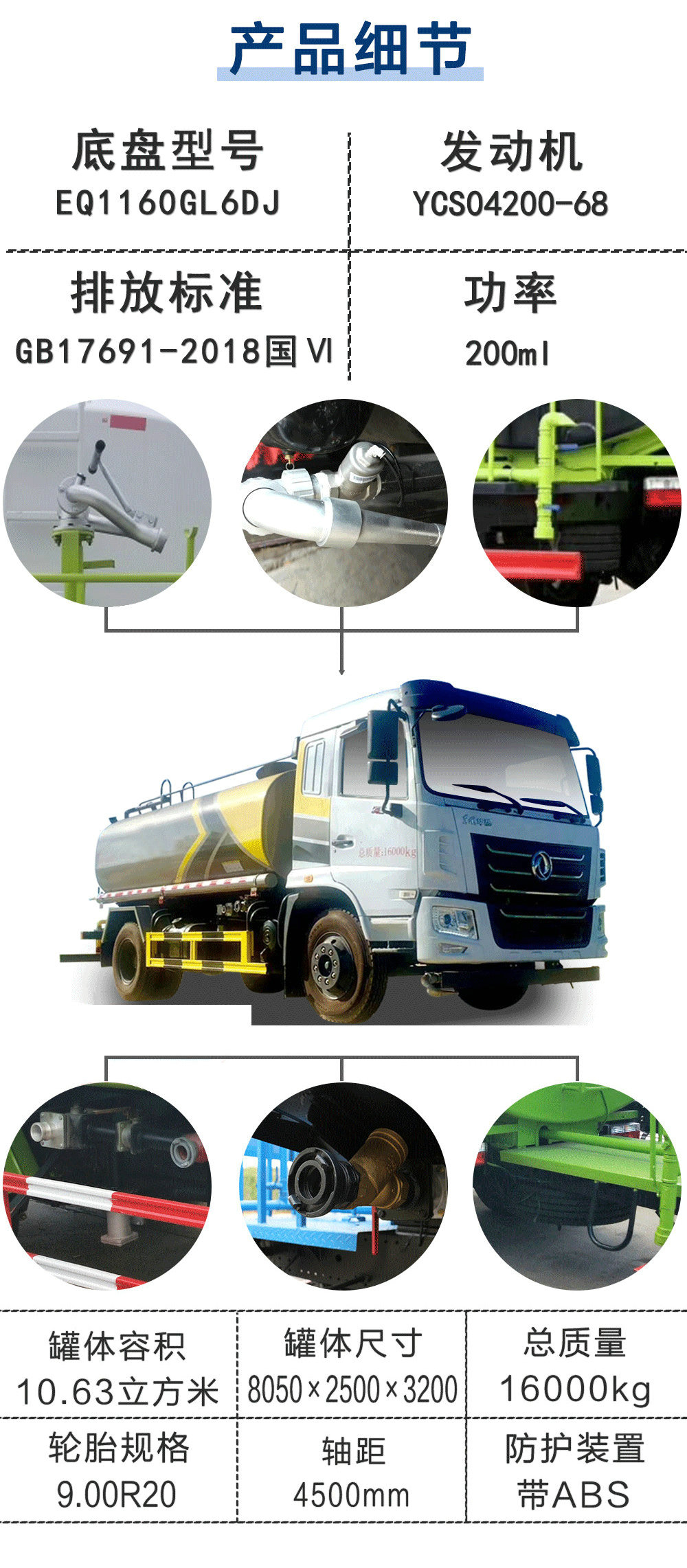 | 其他 | 專用裝置:罐體,主要用于路面灑水及園林綠化.罐體有效容積10.63立方米,罐體外形尺寸(長度×長軸×短軸)(mm):4200×2350×1500.整車長/軸距/前懸/后懸對應(yīng)關(guān)系(mm):7700/3950/1250/2500,7700/3950/1450/2300,7700/4200/1250/2250,8050/4500/1250/2300,8250/4700/1250/2300.側(cè)面防護(hù)材料:Q235A碳鋼.連接方式:左右側(cè)面采用螺栓連接.后防護(hù)裝置材料:Q235B碳鋼.連接方式:采用焊接連接.后部防護(hù)斷面尺寸(mm):150×60,后部防護(hù)離地高度(mm):500.ABS型號及生產(chǎn)廠家為:3631010-C2000/東科克諾爾商用車制動系統(tǒng)(十堰)有限公司,J ABS/焦作博瑞克控制技術(shù)有限公司. | ||