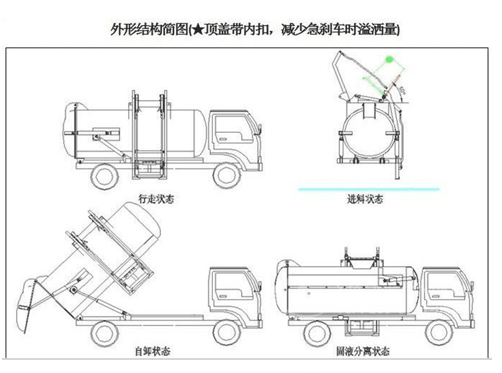 | 其他 | 1、該車僅選用2800mm軸距底盤。2、可選裝內(nèi)部卸料裝置,不影響整車外觀,但會引起整車重量變化,選裝相關(guān)配置時整備質(zhì)量/額定載質(zhì)量對應關(guān)系為(kg):無推板裝置時:3400/965,3650/715。選裝推板裝置時:3850/515。3、防護材料:Q235B碳鋼,連接方式:左側(cè)面防護采用焊接連接,右側(cè)面防護及后下部防護由專用裝置代替,后部專用裝置離地高度(mm):480。4、ABS型號:CM4XL-4S/4M,ABS生產(chǎn)企業(yè):廣州瑞立科密汽車電子股份有限公司。5、專用裝置:側(cè)裝垃圾桶提升裝置,主要用于餐廚垃圾收集及轉(zhuǎn)運。6、隨底盤選裝駕駛室。 | ||