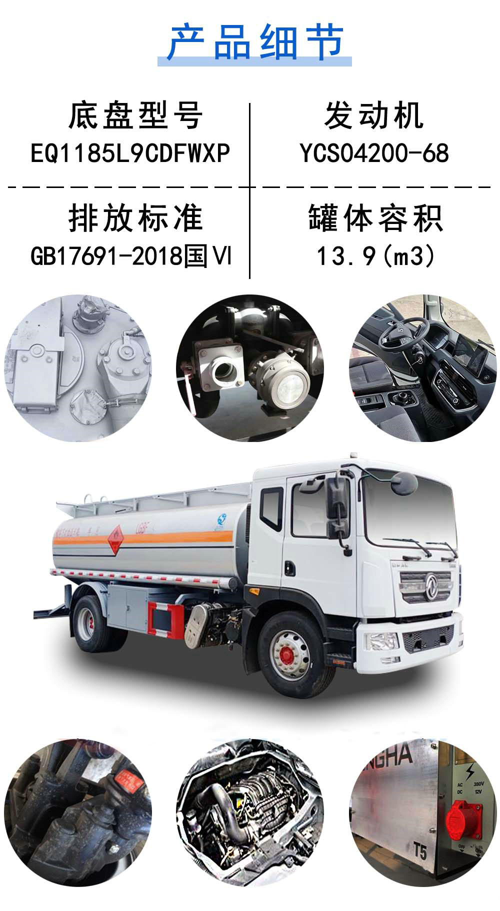 | 其他 | ABS型號(hào):J ABS,ABS/ASR-24V-4S/4M;ABS生產(chǎn)企業(yè):焦作博瑞克控制技術(shù)有限公司,襄陽(yáng)東風(fēng)隆誠(chéng)機(jī)械有限責(zé)任公司;安裝有限速裝置;限速裝置限速(km/h):80;安裝有具有衛(wèi)星定位功能的行駛記錄儀;發(fā)動(dòng)機(jī)凈功率值:B6.2NS6B230(166kw),D4.5NS6B220(157kw),YCS04200-68(143kw),CY4SK761(142kw);發(fā)動(dòng)機(jī)/油耗值(L/100km)對(duì)應(yīng)關(guān)系為:B6.2NS6B230(26.7),D4.5NS6B220(26.6),YCS04200-68(26.4),CY4SK761(26.8);側(cè)后防護(hù)情況:防護(hù)材料:左右側(cè)面Q235B碳鋼,后下部鋁合金,連接方式:左右側(cè)面及后下部防護(hù)均采用焊接連接,后下部防護(hù)斷面尺寸(mm):140×50,后下部防護(hù)離地高度(mm):480;罐體有效容積(立方米)、罐體外形尺寸(mm):罐體有效容積:13.9立方米,罐體外形尺寸(長(zhǎng)×長(zhǎng)軸×短軸)(mm):5800×2100×1450;FL型車輛;危險(xiǎn)貨物類項(xiàng)號(hào):3;其他說明:該車適用于危險(xiǎn)品運(yùn)輸。僅采用底盤子午線輪胎和帶ABS的底盤,該車前輪安裝盤式制動(dòng)器,前置排氣管,轉(zhuǎn)向輪安裝輪胎爆胎應(yīng)急防護(hù)裝置,該車后軸為采用空氣懸架。整車長(zhǎng)度/軸距/前懸/后懸的對(duì)應(yīng)關(guān)系為(mm):8330/4700/1260/2370。該車型可選裝ETC車載裝置。 | ||