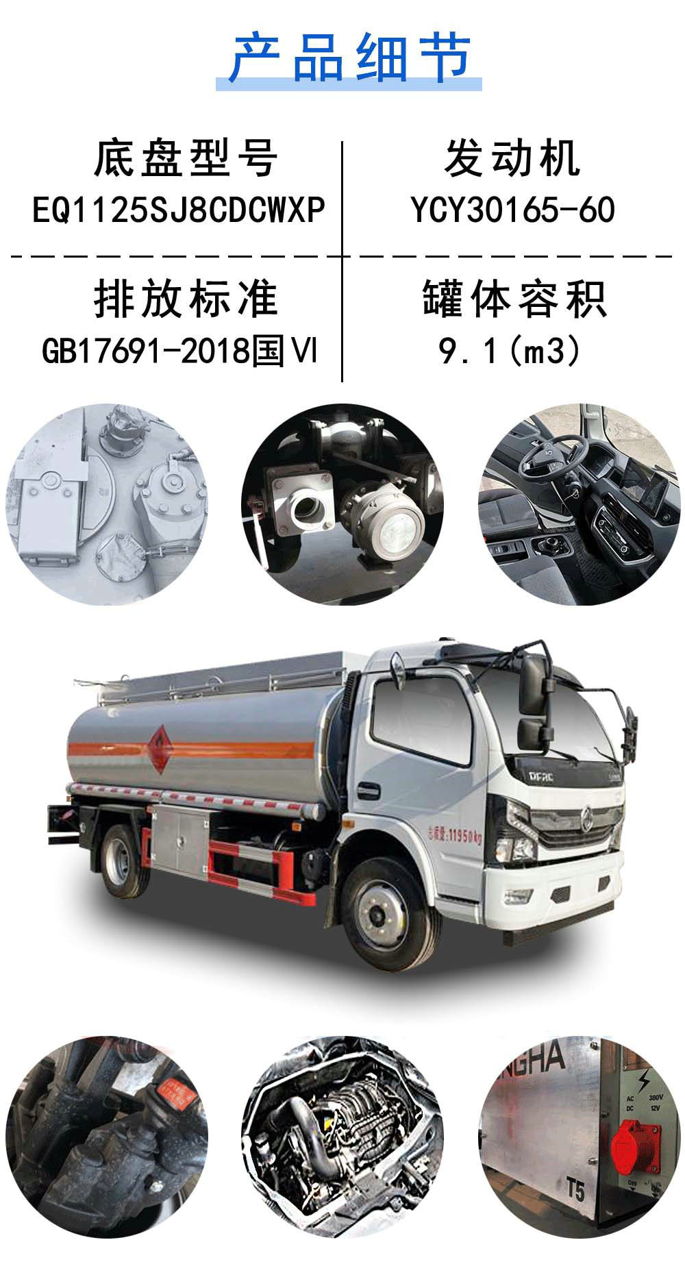 | 其他 | 該車適用于危險品運輸。運輸類項號:3,罐體有效容積:9.1立方米。罐體外形尺寸(長×長軸×短軸)(mm):4700×2000×1400。連接方式:左右側(cè)面防護及后部防護均采用焊接連接,左右側(cè)面防護及后部防護材料:Q235B碳鋼,后下部防護斷面尺寸(mm):120×50,后部防護離地高度(mm):390。僅采用底盤子午線輪胎和帶ABS的底盤,該車前輪安裝盤式制動器,前置排氣管,裝配限速裝置,限速80km/h。安裝帶有衛(wèi)星定位功能的行駛記錄儀。ABS型號/廠家:ABS型號:ABS/ASR-24V-4S/4M,廠家:襄陽東風隆誠機械有限責任公司。危險貨物運輸車輛的類型(FL型車輛)。發(fā)動機型號及對應油耗值(L/100km)分別為CY4SK261(21.3),CY4SK361(21.3),D25TCIF1(21.3),D30TCIF1(21.3),YCY30165-60(21.3)。隨底盤選裝前面罩,前保險杠,前組合燈具,前霧燈。轉(zhuǎn)向輪安裝輪胎爆胎應急防護裝置。 | ||