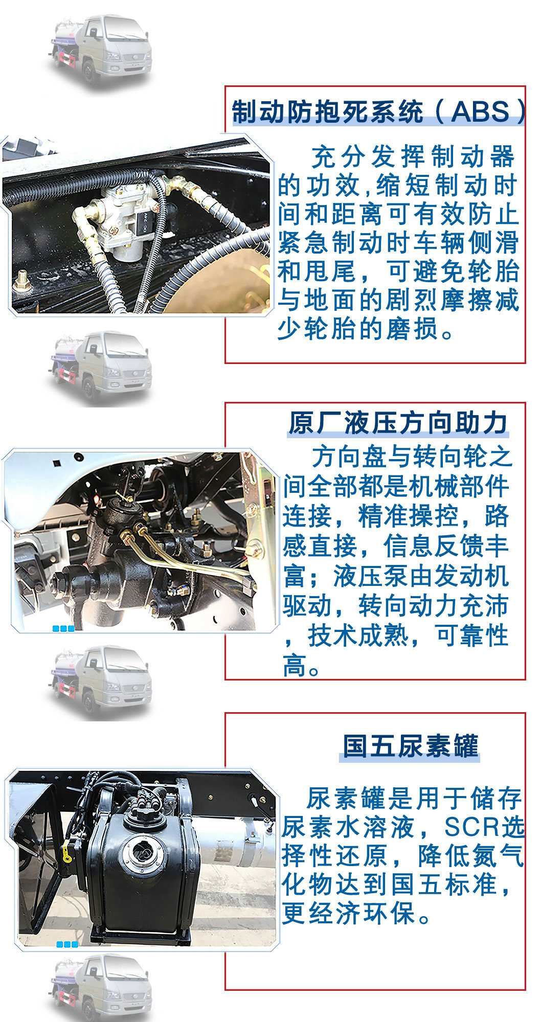 | 其他 | 1,介質(zhì):液態(tài)污物和糞便,密度:800千克/立方米,罐體有效容積:2.07立方米,罐體外形尺寸(長(zhǎng)×長(zhǎng)軸×短軸)(mm): 2600×1300×900。2,防護(hù)材料:Q235A,連接方式:側(cè)防護(hù)與副梁焊接連接,后防護(hù)與車架焊接連接,后部防護(hù)斷面尺寸(mm):200×50,后部防護(hù)離地高度(mm):500。3,ABS系統(tǒng)控制器型號(hào):YF8,ABS系統(tǒng)控制器生產(chǎn)企業(yè):武漢元豐汽車電控系統(tǒng)有限公司。4,車輛顏色,文字噴涂及局部細(xì)節(jié)可變化。 | ||
