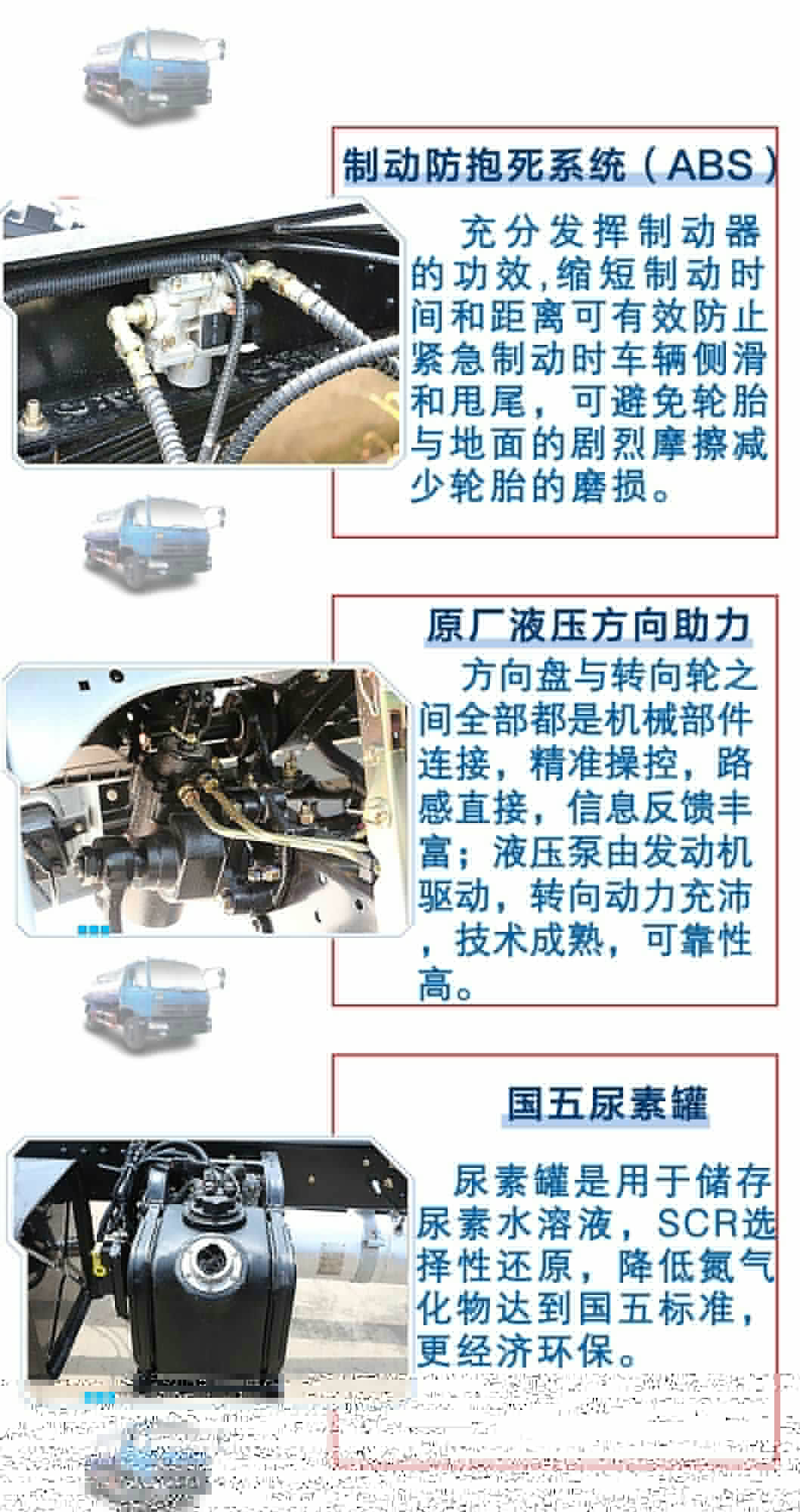 | 其他 | 1,整車(chē)長(zhǎng)度,罐體外形尺寸(長(zhǎng)×長(zhǎng)軸×短軸),軸距,前懸與后懸的對(duì)應(yīng)關(guān)系為(mm):8200/(5000×2200×1350)/4700 /1440/2060;8010/(5000×2200×1350)/4700 /1250/2060;8000/(4800×2200×1450)/4500/1440/2060;7810/(4800×2200×1450)/4500/1250/2060;7450/(4250×2300×1560)/3950/1440/2060;7260/(4250×2300×1560)/3950/1250/2060。2,側(cè)防護(hù)及后下部防護(hù)裝置均采用Q235A材質(zhì),均采用焊接連接,后下部防護(hù)尺寸:150×50(mm),離地面高度500mm。3,ABS的型號(hào): ABS-E 4S/4M,生產(chǎn)廠家: 威伯科汽車(chē)控制系統(tǒng)(中國(guó))有限公司。4,文字噴圖位置、車(chē)輛顏色及局部細(xì)節(jié)可變化。5,隨底盤(pán)選裝駕駛室。6,軸距變化引起質(zhì)量變化小于3%。7,專用裝置:罐體,主要用于抽排糞便。 | ||