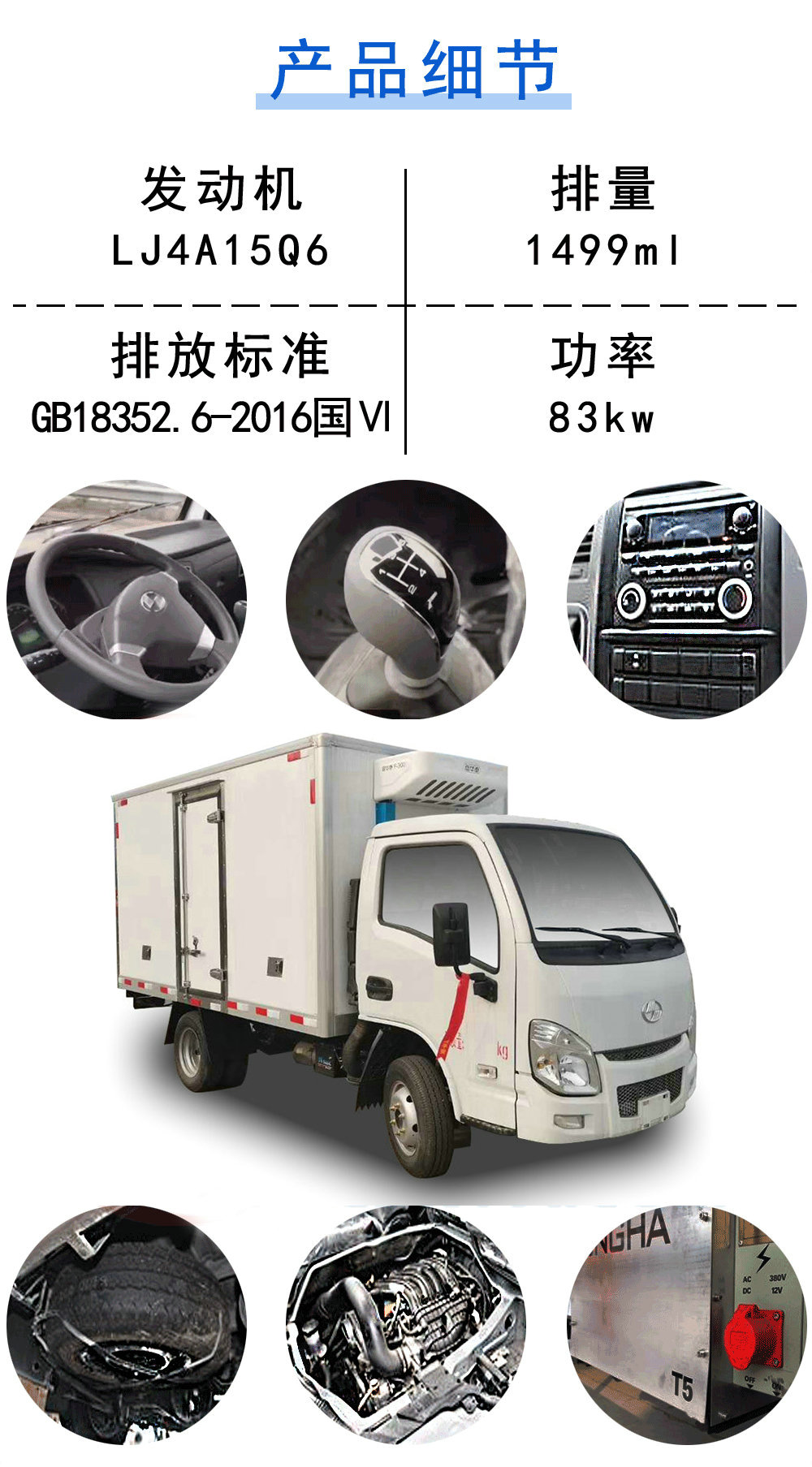 | 其他 | 1.ABS控制器型號(hào)/生產(chǎn)廠家:YF8/武漢元豐汽車電控系統(tǒng)有限公司;2.LJ4A15Q6凈功率為79kw,對(duì)應(yīng)油耗值為9.6L/100km;3.車廂頂部封閉不可開啟;4.車廂可選裝不開門或側(cè)開門,可選裝左或右側(cè)開門,不同外觀側(cè)門和后門;5.可選裝導(dǎo)流罩;6.選裝其他廠家功率相當(dāng)?shù)闹评錂C(jī)組,KV300英格索蘭(中國(guó))投資有限公司,K125勁達(dá)技術(shù)(河源)有限公司,MK358勁達(dá)技術(shù)(河源)有限公司;7.冷藏車類別:F類;8.隨底盤選裝駕駛室前圍面板,前圍格柵,后視鏡,前部燈具,前保險(xiǎn)杠外觀,擴(kuò)展輪輞外觀,擴(kuò)展輪眉,隨底盤選裝排半駕駛室;9.駕駛室左側(cè)車門選裝裝飾標(biāo)貼. | ||