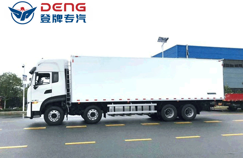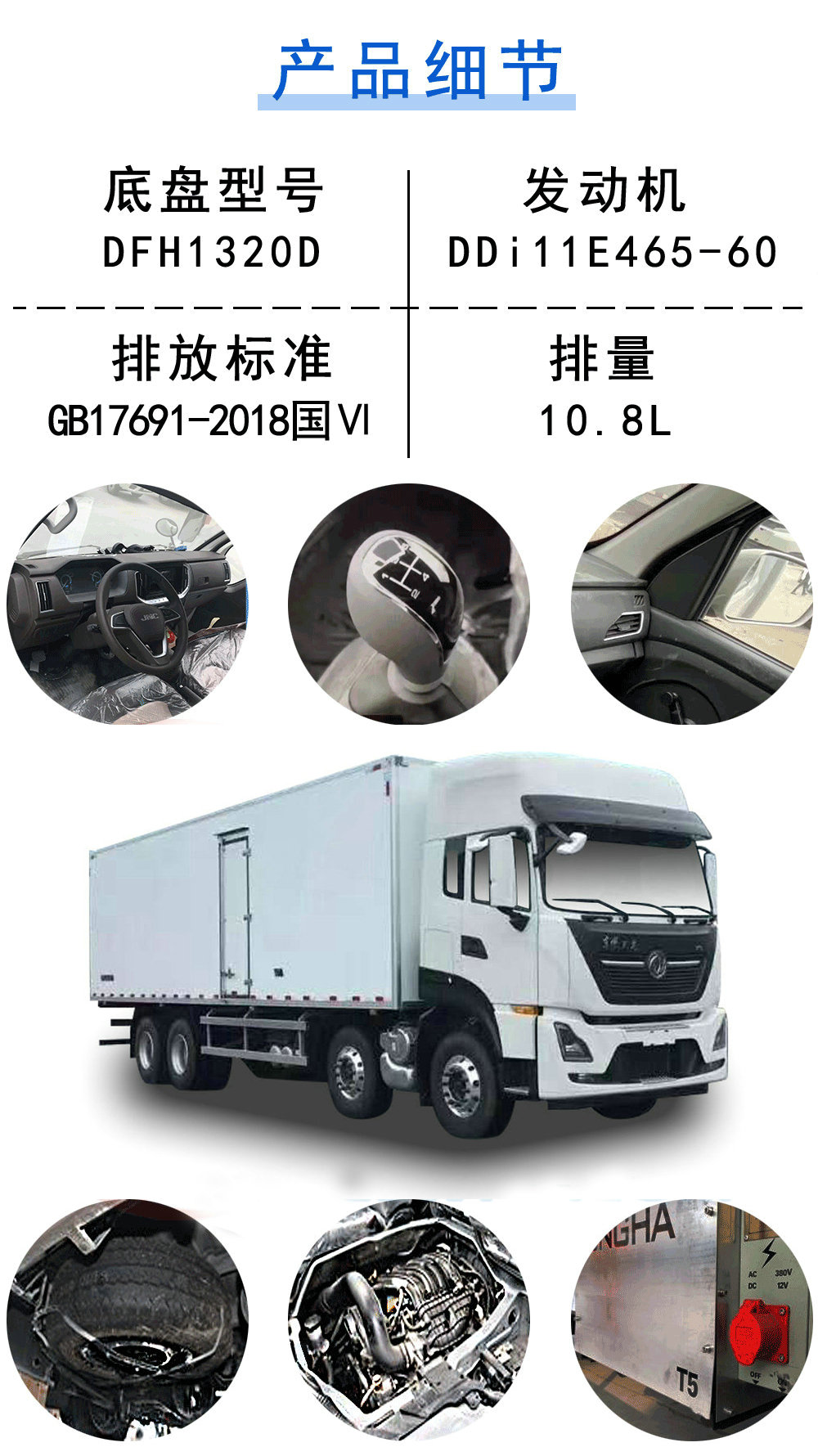 | 其他 | 隨底盤選裝僅高度不同的駕駛室,高頂駕駛室頂部氣喇叭為選裝件,駕駛室前角擾流板為選裝件,選裝單油箱或雙油箱;貨廂選裝單開門,雙開門和不開門型式;選裝其它廠家功率相當(dāng)?shù)闹评錂C(jī)組,選裝前置式,內(nèi)置式,底置式制冷機(jī)組;選裝升降尾板,尾板收起狀態(tài)時(shí)的水平長度為295mm;廂體頂部封閉,不可開啟;側(cè)防護(hù):材料Q235,螺栓連接;后下防護(hù):材質(zhì)Q235.螺栓連接,斷面尺寸120×60mm,離地高度460mm;安裝具有衛(wèi)星定位功能的行駛記錄儀;裝有ABS,ABS型號(hào)/生產(chǎn)廠家:ABS 8/東科克諾爾商用車制動(dòng)系統(tǒng)(十堰)有限公司;發(fā)動(dòng)機(jī)DDi11E465-60對(duì)應(yīng)油耗申報(bào)值37.1L/100km. | ||